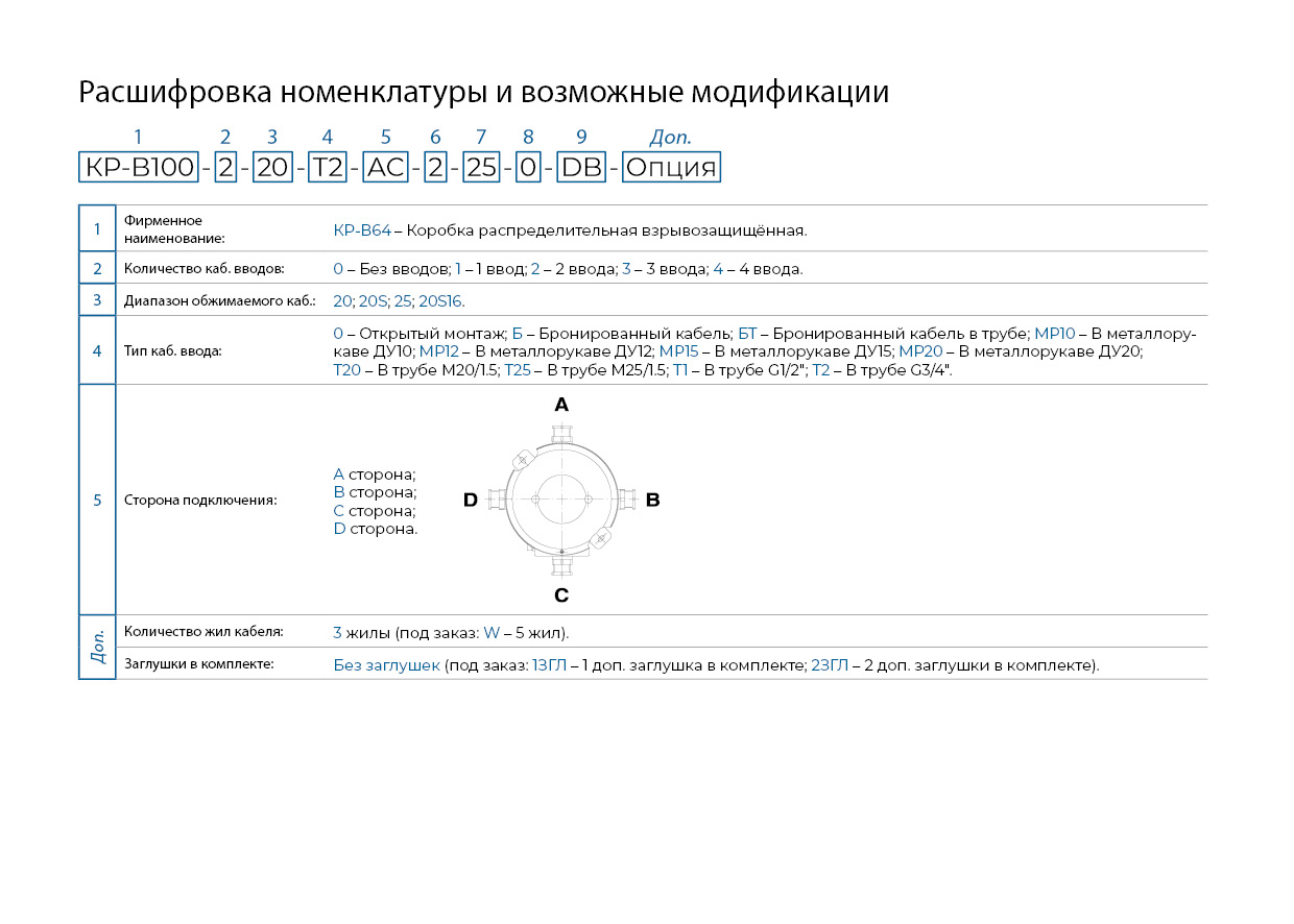 Взрывозащищенные коробки распределительные предназначены для выполнения соединений и ответвлений кабельных электропроводок, проложенных в помещениях и наружных установках во взрывоопасных зонах классов 1 и 2 по ГОСТ Р 52350.10, ГОСТ Р 52350.14 и другим нормативным документам, регламентирующим применение взрывозащищенного электрооборудования