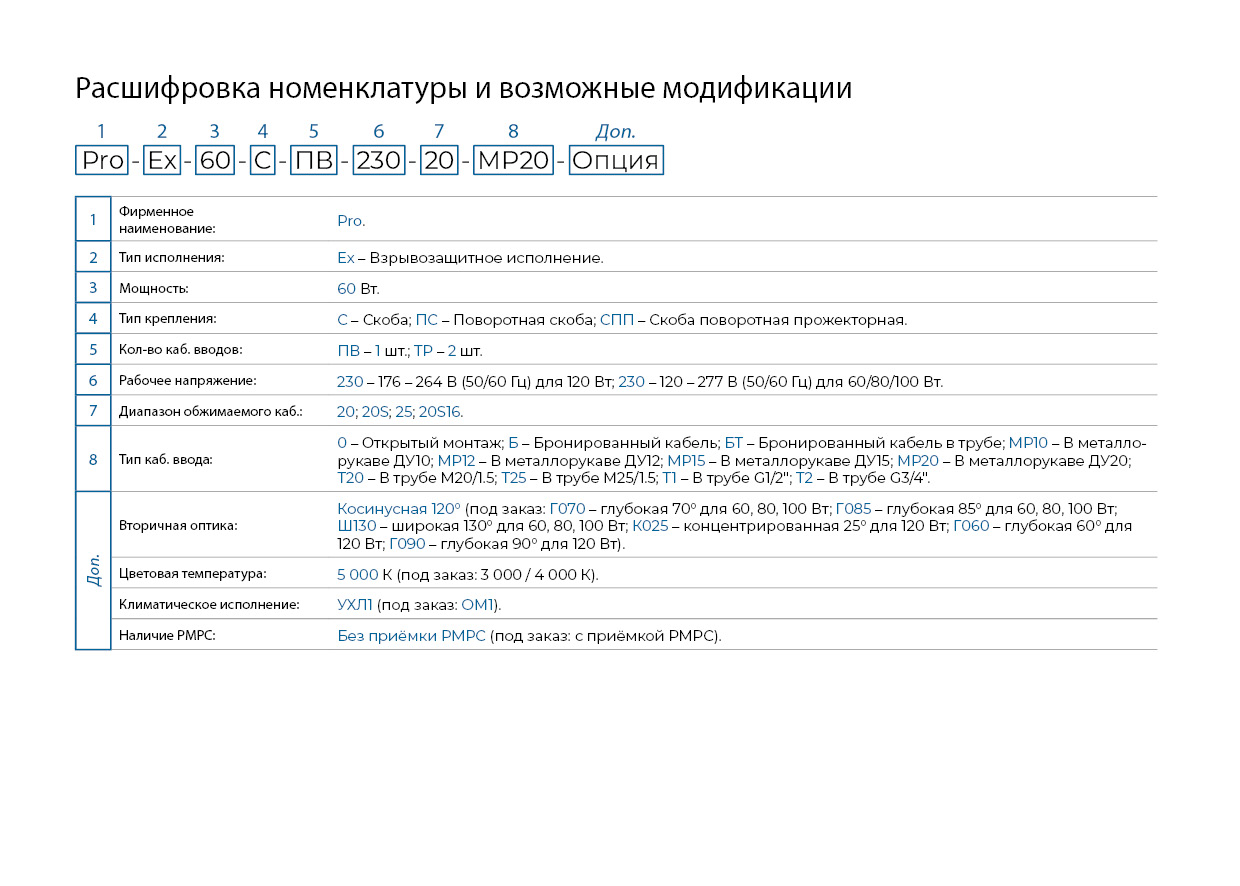 Прожектор светодиодный взрывозащищенный ProEx имеет комбинированный вид взрывозащиты db взрывонепроницаемая оболочка для коммутационного отсека источника питания и mb – заливка компаундом для светооптического отсека, маркировку взрывозащиты 1Ex db mb IIC и предназначен для освещения взрывоопасных зон классов 1 и 2 в помещениях и на открытых площадках, в том числе для освещения предприятий нефтегазовой и нефтехимической промышленности, где требуется увеличенная высота подвеса светильника