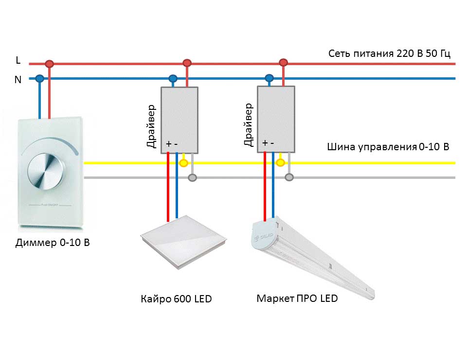 В области внутреннего освещения наиболее простой и популярной сейчас является система группового управления 0-10 В, в которой на специальный вход драйвера или электронного пускорегулирующего аппарата подаётся постоянное напряжение (рис. 1). Величина этого напряжения определяет величину светового потока светильника: 0 В — 0 %, 10 В — 100 %. Аналогичным образом функционирует система управления 1-10 В, только величина управляющего напряжения в 1 В определяет минимально возможный световой поток, а при подаче 0 В на вход управления, светильник выключается.
