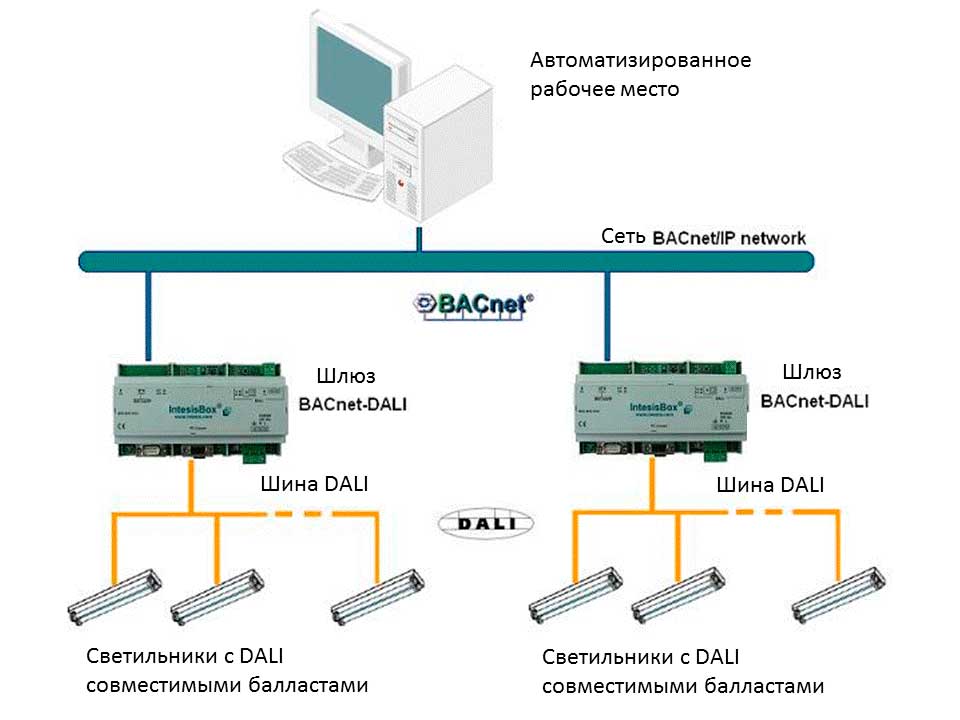 Рисунок 5. Пример интеграции системы управления освещением на основе протокола DALI в систему управления зданием на основе BACnet протокола.