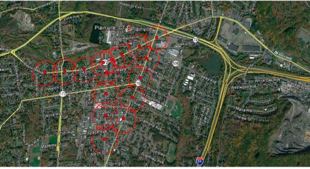 Рисунок 6. Схема расположения светильников с Wi-Fi доступом в сеть Интернет в городе Плэйнвиль, штат Коннектикут, США.