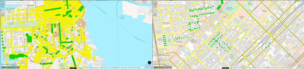 Рисунок 12. Онлайн-карта Сан-Франциско. Жёлтая точка – планируется к замене на светодиодный светильник, зелёная – уже заменён.