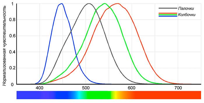 Распределение типов колбочек по сетчатке неравномерно: «синие» колбочки находятся ближе к периферии, в то время как «красные» и «зеленые» распределены случайным образом. В результате суммы импульсов от трех видов колбочек человек «видит» определённый цвет. При этом ощущение одного и того же цвета может быть вызвано светом с различным спектральным составом (такое явление называется метамерией). Скажем, и солнечный дневной свет, и свет от люминесцентной или светодиодной лампы мы посчитаем одинаковым — белым. Хотя на самом деле спектр излучения здесь совершенно разный, у солнца — сплошной, а у газоразрядной лампы — линейчатый.