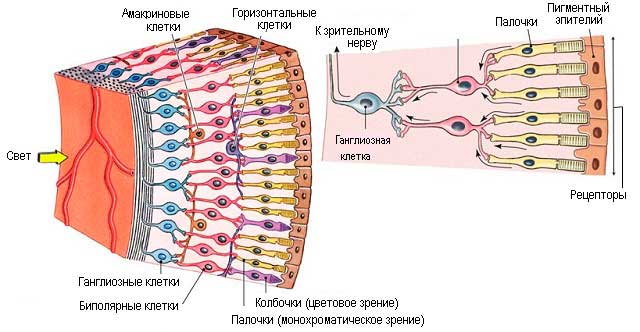 Есть два типа фоторецепторов: палочки и колбочки. Палочки отвечают за ночное зрение и работают в условиях низкой освещённости, обладая очень высокой чувствительностью. При этом цветовое восприятие практически отсутствует —«ночью все кошки серы». Колбочки же обеспечивают «дневное зрение» и бывают трёх типов – восприимчивые к синему, красному или зелёному свету.