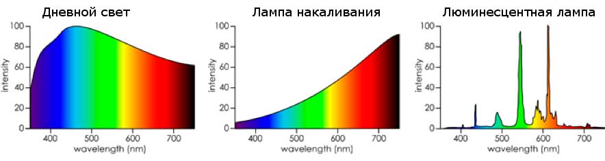 Рисунок 5. Примерные спектры излучения солнца, лампы накаливания, люминесцентной лампы.