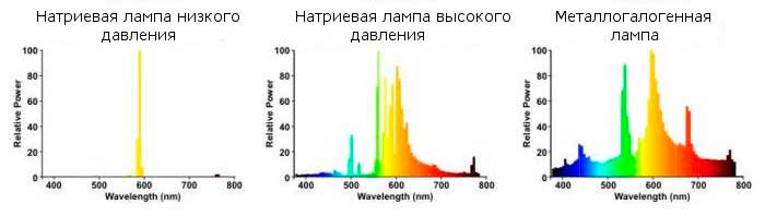 Рисунок 6. Примерные спектры излучения натриевой лампы низкого давления, натриевой лампы высокого давления, металлогалогенной лампы.