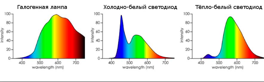 Рисунок 7. Примерные спектры излучения галогенной лампы накаливания, холодно-белого светодиода и тёпло-белого светодиода.