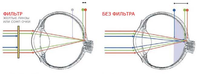 Синий свет, как самый коротковолновый, фокусируется перед сетчаткой, а на самой сетчатке вместо точки (исходного объекта) получается пятно (размытое, нерезкое изображение). Большая степень размытости изображения означает снижение контрастности и четкости, снижение остроты зрения. А вот если убрать синий свет, а оставить только жёлто-зелёную и красную часть излучения, то картинка для глаза станет намного более чёткой, и разглядывать отдельные объекты будет легче. Например, снайперы и спортсмены для того, чтобы чётко видеть окружающие объекты, а значит быстрее и лучше ориентироваться в обстановке,используют очки с покрытиями, отфильтровывающими синий свет.[3]