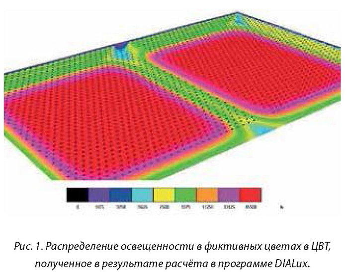 Уровень освещенности является исходным параметром для светотехнического расчёта осветительной установки ЦВТ, который для выбранного типа светового прибора выполняется, в основном, по программе DIALux. В результате расчёта определяется распределение освещенности по технологической площади с заданным коэффициентом неравномерности и схема расположения светильников с учетом конструкции теплицы и архитектоники ценоза. На рис. 1 в качестве примера, приведено распределение освещенности в теплице в результате компьютерного расчёта.