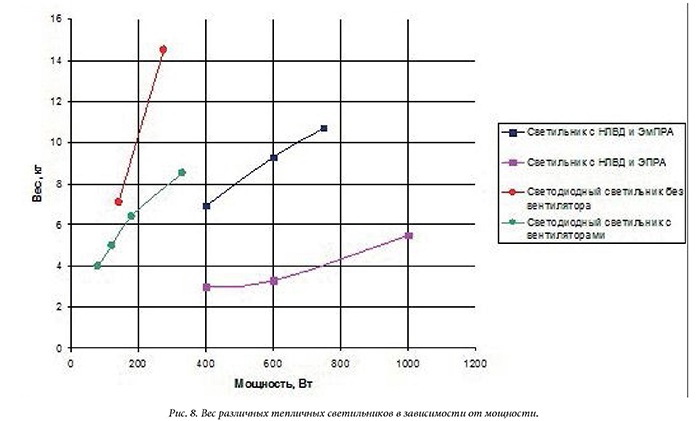 1. Светодиодный облучатель достаточно тяжелый световой прибор. Для соответствующих мощностей его вес превышает вес светильников с электромагнитным ПРА. Количественные данные приведены на рис. 8. Таким образом, желающим использовать светодиодные светильники необходимо быть готовыми к высокой нагрузке на теплицу.