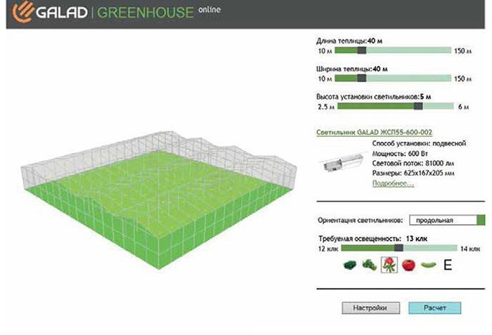 На сайте www.galad.ru (Продукция — «Тепличное») начал функционировать «калькулятор» для ориентировочного расчета осветительной установки при варьировании размера теплицы, уровня освещенности и высоты подвеса светильников. Выбрав тип светильника с определенной мощностью лампы и формой кривой силы света пользователь может быстро и наглядно получить необходимые расчётные данные (например, ориентировочное количество светильников, потребляемая мощность и т.д.) и обоснованно сформулировать техническое задание светотехникам для проектирования осветительной установки.