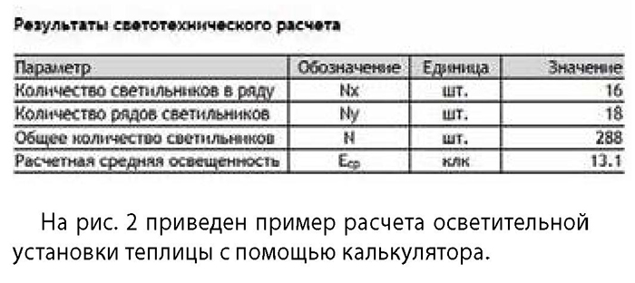 Рис 2. Пример расчета с помощью он-лайн калькулятора расчёта освещения теплиц, представленного на сайте www.galad.ru