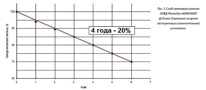 Среди них — вопрос о экономически целесообразном сроке службы, требующем групповой замены ламп. Физический срок службы у современных фито-НЛВД достигает 40 тыс.час, однако в процессе эксплуатации их световой поток, определяющий меру эффективности, постепенно снижается. Как показали наши прямые испытания, проводимые на лампах PlantaStar 600W/400V ф. Озгат (Германия) (рис. 3), к 20 тыс. часам, что соответствует, примерно, 4 годам эксплуатации, величина спада достигает 20%. В современной ЦВТ с начальным уровнем освещенности 12 клк это означает снижение до 9,6 клк.
