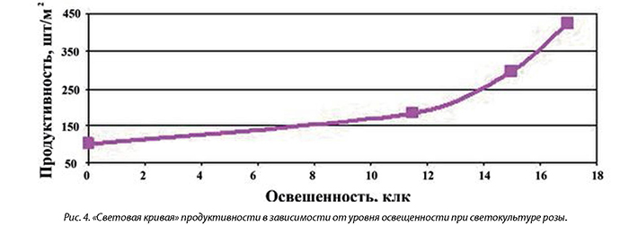 Попробуем оценить, как это скажется на выходе продукции в теплице с розами. Для этого воспользуемся «световой кривой» голландского происхождения, описывающей зависимость продуктивности от уровня освещенности при светокультуре розы (рис. 4). Кривая, конечно, может рассматриваться, как ориентировочная, имеющая «методическое» значение, поскольку, продуктивность зависит от многих факторов и, в том числе, от сорта растения. Тем не менее, мы считаем вполне возможным использовать эту зависимость для количественных оценок влияния спада светового потока ламп и, соответственно, освещенности в теплице на потери выхода цветка.
