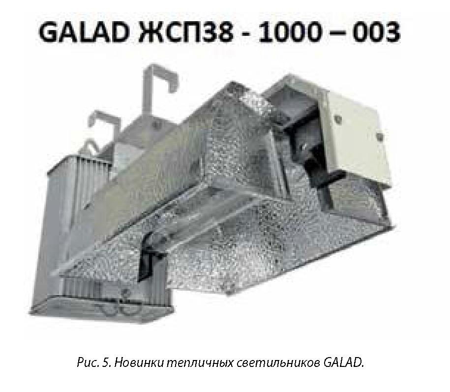 На рис. 5 фото новых светильников GALAD, а на рис. б представлен фрагмент осветительной установки со светильниками ЖСП38-1000-003 в тепличном комбинате „Мир цветов“ (Респ. Мордовия).