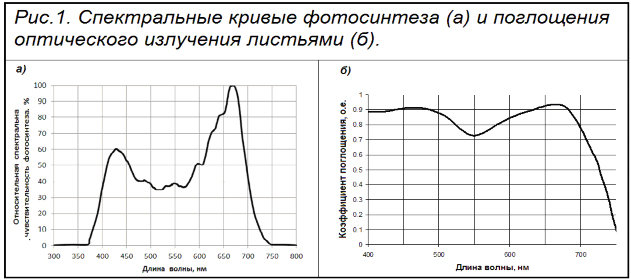 Для обеспечения фотосинтетической деятельности растений (при этом неважно, представлена хозяйственноценная часть урожая листовой биомассой или плодами), естественно предположить, что СДфитооблучатель должен преимущественно излучать в диапазонах максимального поглощения ФАР листьями с учетом максимумов спектра действия фотосинтеза в синей и красной областях. Соответствующие зависимости приведены на рис. 1.