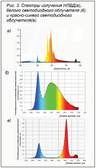 В экспериментальном облучателе использовали СД типа XRC мощностью 1 Вт фирмы Cree красного и синего свечения, при этом доля красного излучения составляла 70% и синего — 30%. Спектры использовавшихся облучателей приведены на рис. 3.
