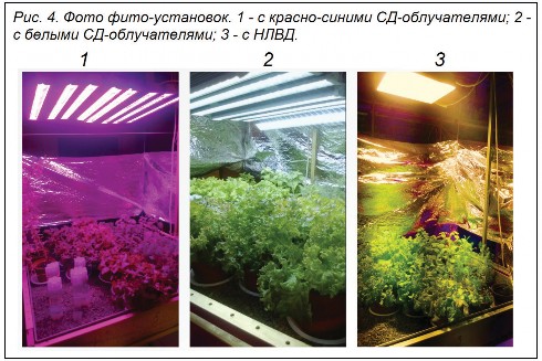 Для исследования были отобраны 2 сорта салата: Афицион и Кармези фирмы Rijk Zwaan, отличающиеся высокой продуктивностью и используемые в промышленных теплицах. На рис. 4 приведены фото фитоустановок с различными облучателями.