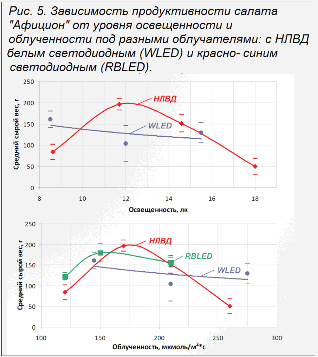 Несмотря на многолетнее использование облучателей с НЛВД в ОУ для светокультуры салата в литературе, практически, отсутствуют данные, обосновывающие выбор предпочтительного уровня освещенности для салатных линий в теплицах. Например, в центре России в различных тепличных хозяйствах он может колебаться от 8 до 14÷15 клк. В наших экспериментах показано, что наибольшая продуктивность всех трёх сортов салата обеспечивается при использовании облучателей с НЛВД с ЕV порядка 12 клк (~170 мкмоль/(м2∙с)), что, безусловно, представляет большой интерес для тепличных хозяйств.