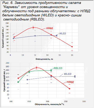 Анализ полученных данных позволяет говорить о наличии, как общих закономерностей в реакции растений на уровень освещенности (облученности) и спектр излучения, так и различий для каждого сорта салата. Отметим, что «классический» вид (наличие выраженного максимума продуктивности) для всех сортов салата имеют только световые кривые, полученные для облучателей с НЛВД и, в какойто мере, с красносиними СД.