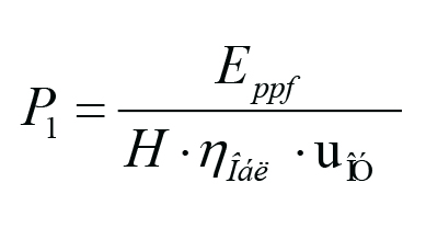 где P1 — установленная удельная энергетическая мощность ОУ в теплице, Вт/м2; Еppf — плотность потока фотонов, мкмоль/(м2∙с); H — фотосинтезный фотонный поток источника излучения, отнесенный к сумме электрической мощности лампы и активных потерь в ПРА (фотосинтезная фотонная отдача), мкмоль/(с∙Вт); ηОбл — к.п.д. облучателя; uОУ — коэффициент использования ОУ (доля потока облучателя, попадающая на технологическую площадь).