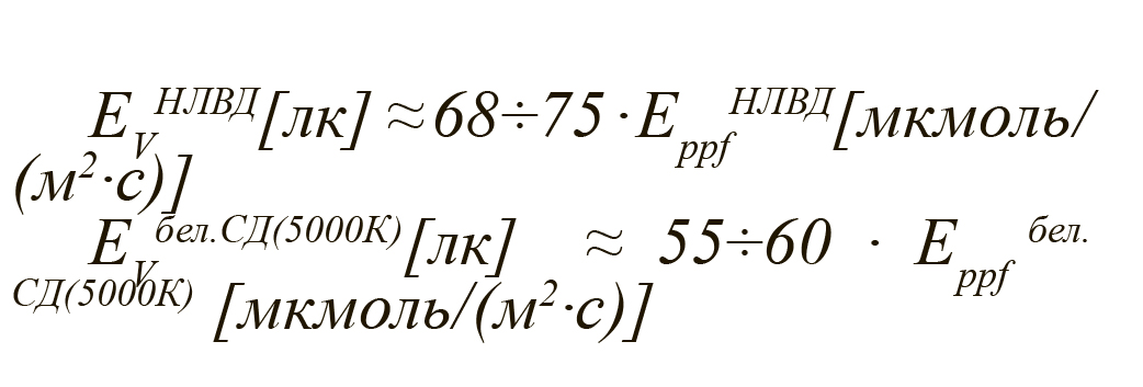 Исходя из собственных экспертных оценок и технологических требований к «салатным линиям» промышленных теплиц, для НЛВД и белых СД был принят диапазон варьирования освещенности в пределах 8÷18 килолюкс (клк). В связи с тем, что использование системы световых величин для облучателей с красносиним спектром невозможно, для измерения облученности мы пользовались фотосинтезной фотонной системой величин, получившей распространение в Нидерландах, США и ряде других стран, но в России пока еще малоиспользуемой. В этой системе величин облученность определяется как поверхностная плотность потока фотонов (квантов) в единицу времени (фотосинтезная фотонная облученность) и измеряется в единицах мкмоль/ (м2∙с). На основе анализа данных зарубежных опытов и собственных оценок в этом случае был выбран диапазон облученностей 100÷300 мкмоль/(м2∙с). Разумеется, чтобы получить данные для сравнений, фотосинтезная фотонная система, наряду со световой, использовалась для измерений облученности под облучателями с НЛВД и белыми СД. Экспериментально установленная связь между освещенностью, измеряемой в люкс (лк), и облученностью (плотностью потока фотонов), измеряемой в мкмоль/(м2∙с), определилась следующими соотношениями для облучателей с НЛВД и белыми СД: